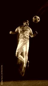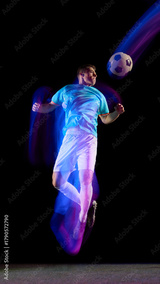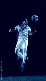 Soccer player heading ball midair with glowing neon motion blur. Concept of determination, energy, and timing used in sport branding, fitness motivation, and digital movement design.