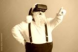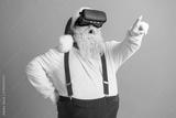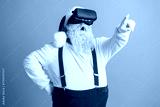 Santa in a VR headset points forward in pink studio wear suspenders white costume festive workshop moment blend tradition and modern holiday