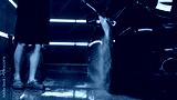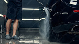 Worker washing car side with high pressure water during detailing. Concept of service marketing, road safety awareness, and educational material for auto care standards.