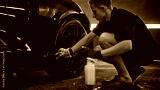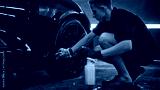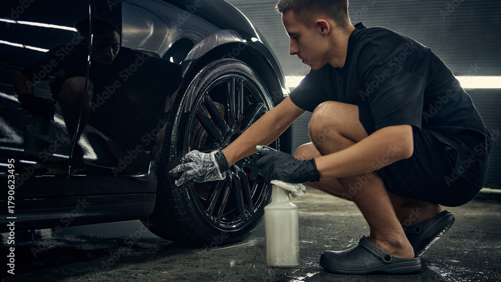 Detailer spraying cleaning solution on car wheel during detailing service. Concept of professionalism, precision, and workflow control in modern auto maintenance.