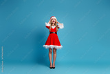 Festive santa dress woman in red fur trim with a blue background ready for christmas photos shoot