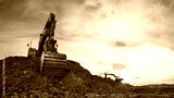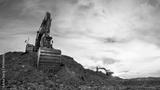 Excavator on earthmoving on sunset. Digger Iron ore mining. Excavator moving. Heavy Machinery in open-pit mining. Earthmover on earthmoving in ore pit. Iron Ore Mining Works in open pit. Environmental