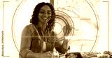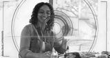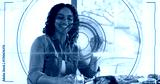 Smiling woman wearing olive jacket sitting at dining table, showing roasted turkey and AR overlay