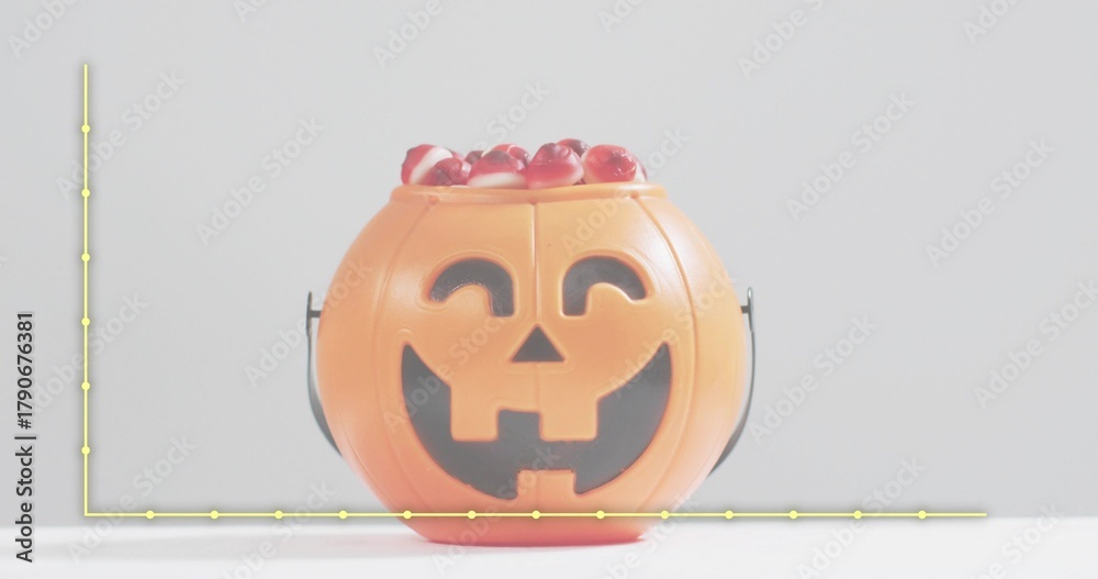 Showing orange jackolantern bucket holding red candies on white top, with yellow axes, black handle