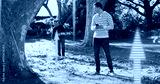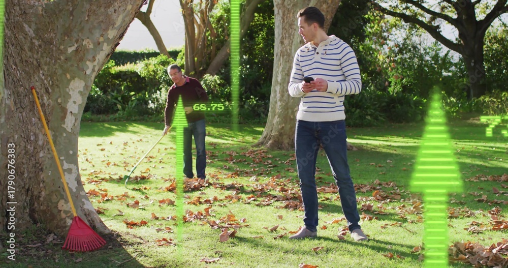 Holding smartphone, man in white-navy hoodie watching raking with green rake at park, AR overlays