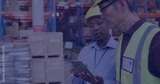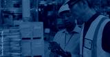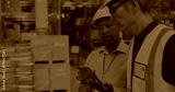 Holding tablet, two workers inspecting inventory in aisle, wearing hard hats and hi-vis vest