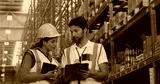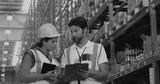 Warehouse staff checking stock in aisle, wearing yellow hard hat, holding tablet and paperwork
