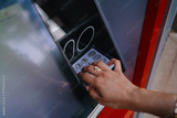 Woman withdrawing cash from ATM, smiling, highlighting the blend of personal finance management and convenience through modern banking technology.