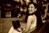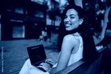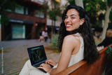 Smiling woman works on laptop in open urban area, showing positivity, adaptability, and tech-enabled productivity in a connected lifestyle.