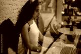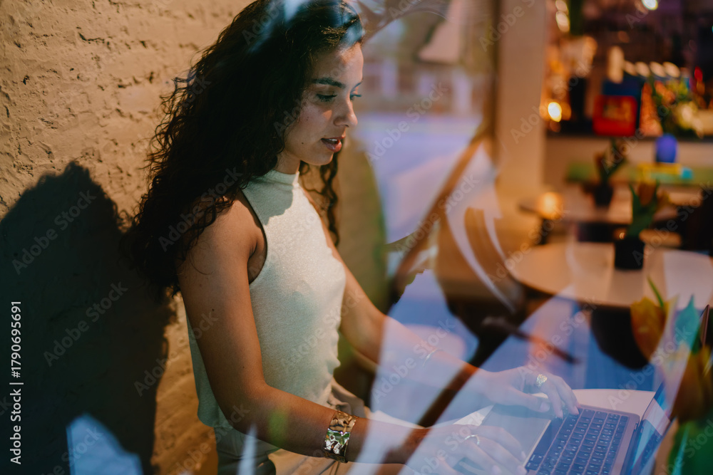Woman typing on laptop inside cafe, seen through glass, symbolizing focus, creativity, and blending private workspace with public ambiance.