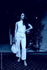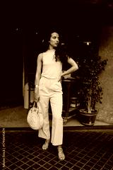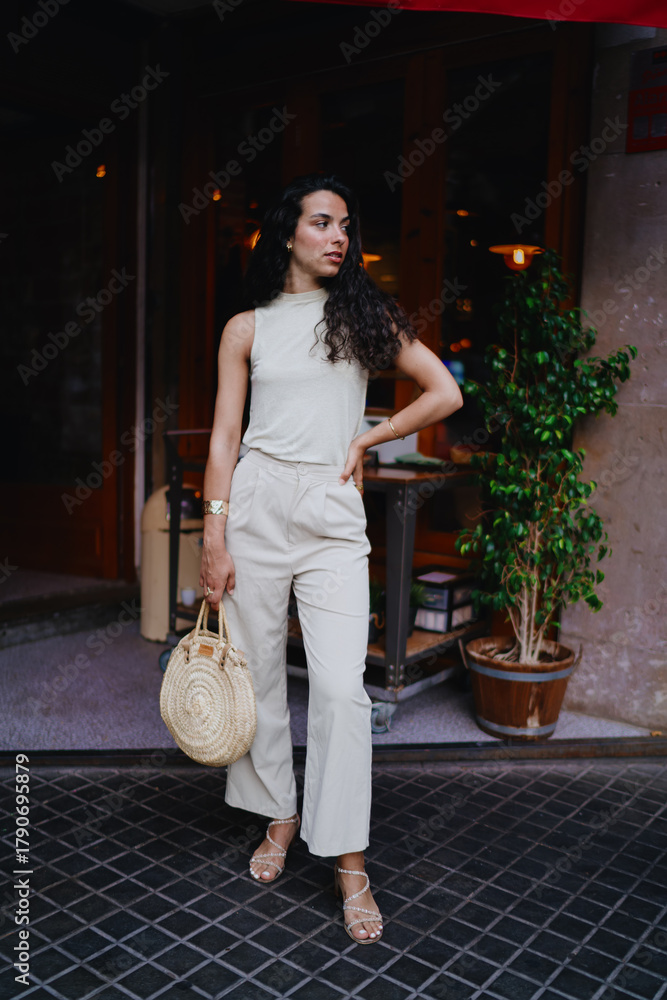 Confident woman standing with handbag, symbolizing independence, personal branding, and readiness for opportunities in a tech-connected urban world.