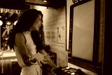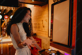 Elegant woman with woven handbag uses ATM, representing independence, mobility, and seamless integration of financial technology in daily routines.