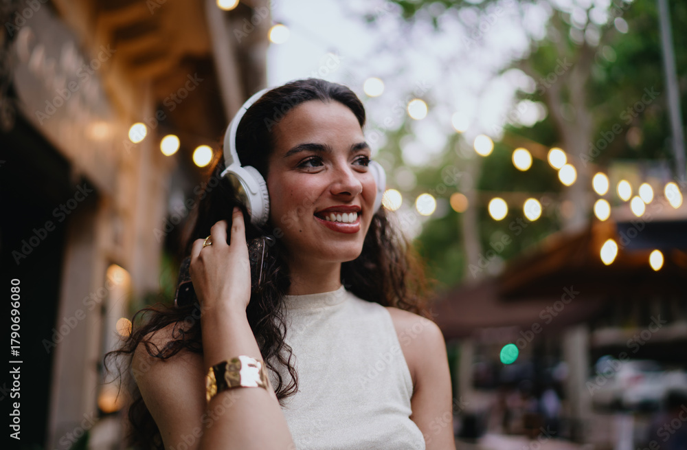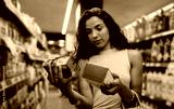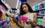 Cheerful woman holding grocery bags in store aisle, symbolizing independence, modern lifestyle, and smart shopping habits in an urban setting.