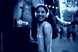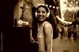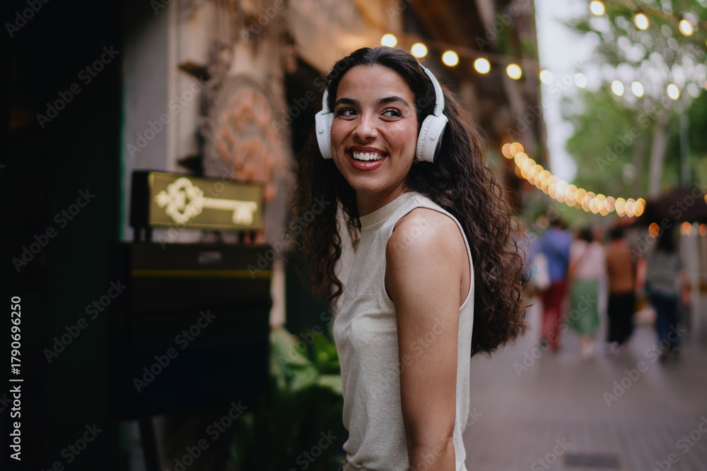 Smiling woman with headphones walks through city street, symbolizing music, tech lifestyle, and immersive travel experiences.