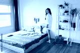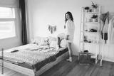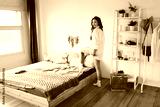 Attractive young woman in oversized white shirt smiling playfully while standing by bed in cozy minimalist bedroom with natural light and soft decor accents.