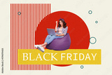 3d sketch poster trend collage image of happy girl sit beanbag hold laptop online remote shopping black friday sale concept