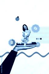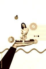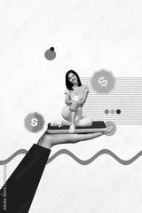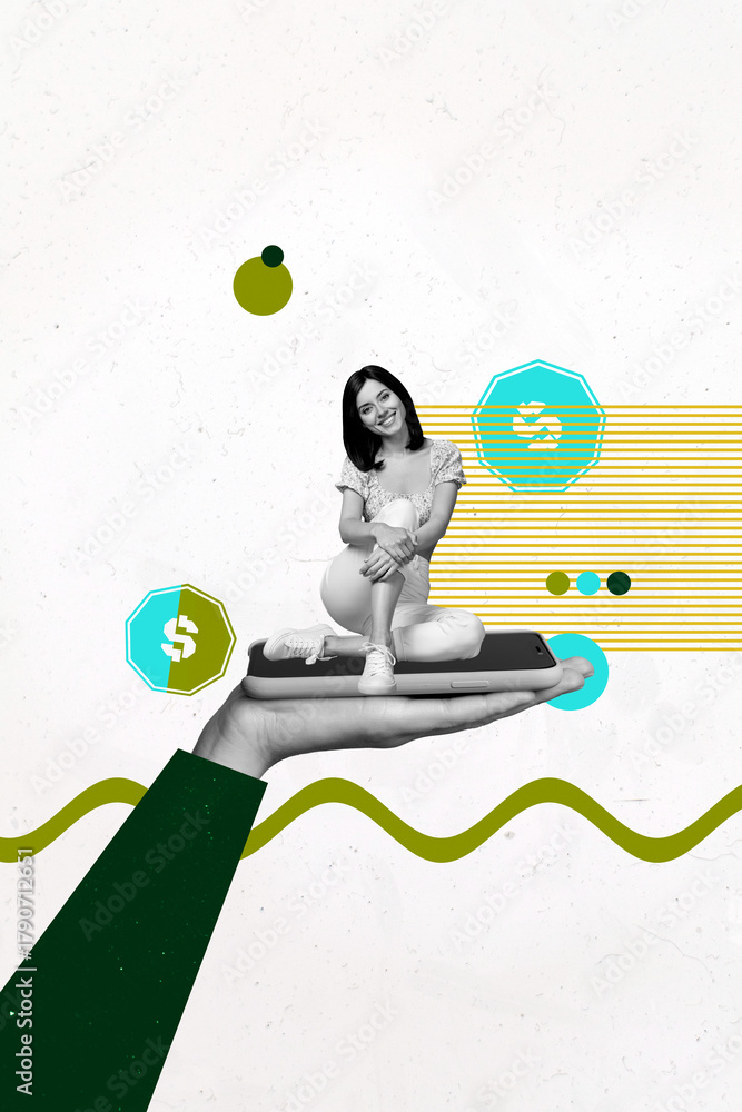Vertical art trend collage of happy businesswoman sit phone screen freelancer profit money income success development dollar