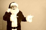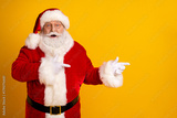 Santa Claus in a red suit with white fur points at the camera against a bright yellow background perfect for Christmas season and holiday promotions
