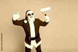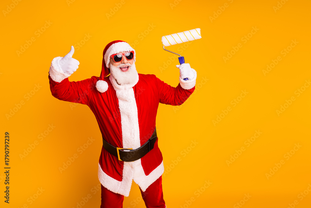 Santa in a bright red costume with a paint roller thumbs up stands against yellow background for festive Christmas energy and holiday joy