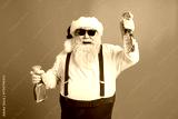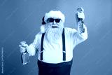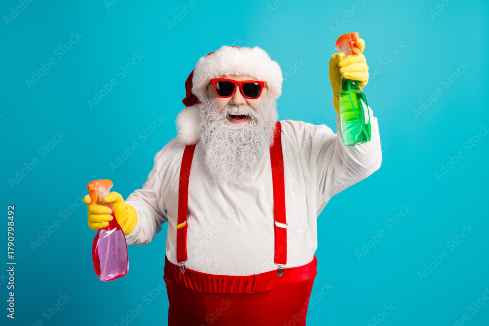 Santa in red suit sprays cleaning solution while wearing yellow gloves and suspenders against bright blue background for festive cleaning fun