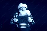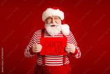 Santa Claus holds a red sign with Santa Claus text in a festive striped outfit against a bold red background for a cheerful Christmas themed stock photo