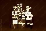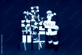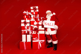 Santa Claus stands beside a towering stack of red and white gifts in bright red studio holding sale sign for Christmas promotions seasonal shopping