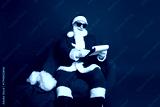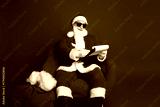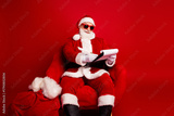 Santa Claus in a red suit sits in a chair reading papers in a festive Christmas scene with bag and fur trim