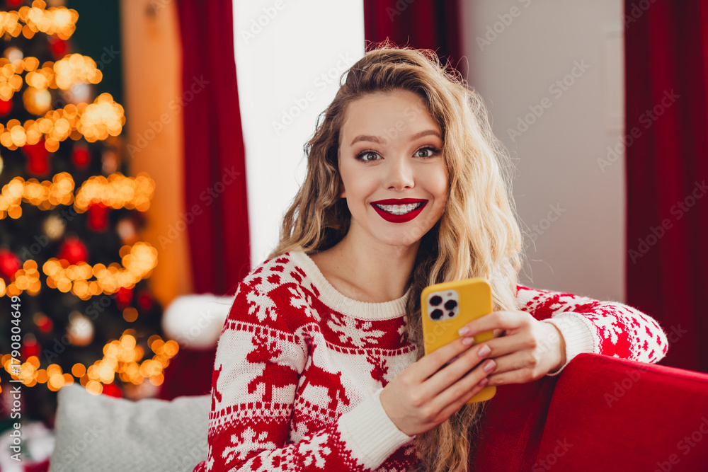 Playful festive moment a young woman in a red white Christmas sweater chats on her phone by the Christmas tree indoors