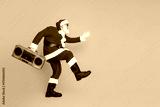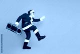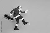 Santa in red suit with boombox runs against yellow background for Christmas fun and festive shopping vibe
