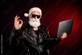Santa rocker in a leather jacket holds a laptop and shows an ok sign for a festive modern vibe