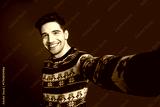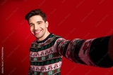 Funny selfie by handsome man in festive Christmas sweater smiling against red background to evoke holiday joy and merry seasonal celebration for shopping gifts and cheerful season vibes