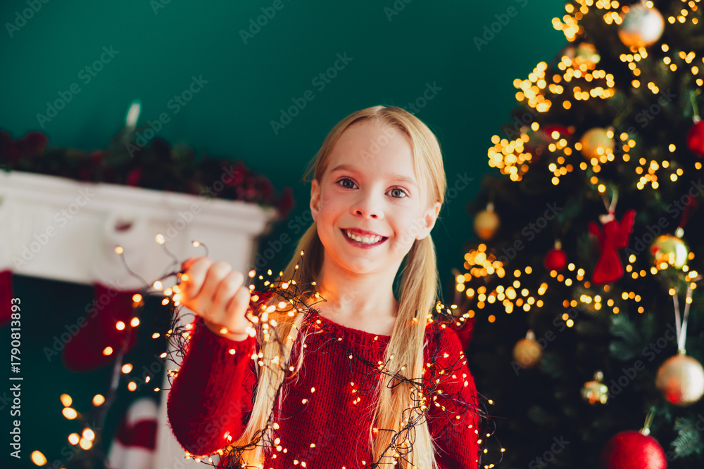 Cheerful girl twirls string lights in a cozy home Christmas scene with a lit tree and joyful holiday magic