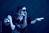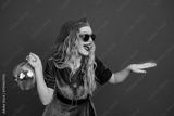 Festive young woman dressed as an elf holding a shiny disco ball and striking a playful pose with excitement