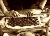 Kneading and rolling cozonac dough on a wooden surface, with a rich walnut filling being spread carefully. The scene captures the essence of cozy baking traditions during the holiday season
