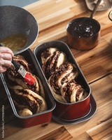 Hands carefully brushing melted butter over braided cozonac dough, highlighting the rich filling. This scene evokes the warmth of traditional baking during holiday gatherings