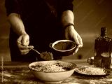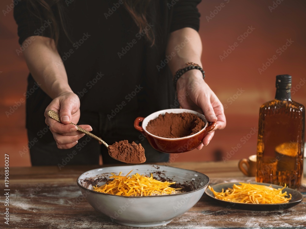 Hands skillfully combine cocoa powder and vibrant orange zest in a charming kitchen setting, embodying the spirit of cozy holiday baking traditions