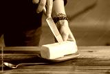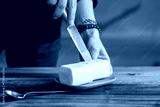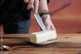 Hands expertly slice a block of creamy butter on a plate, preparing for cozonac-making. This essential ingredient adds richness to the cherished holiday bread