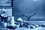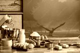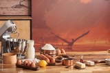 Ingredients for cozonac are laid out ready for baking. Flour, eggs, and butter sit beside a mixer, capturing the cozy and nostalgic atmosphere of holiday traditions