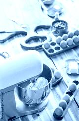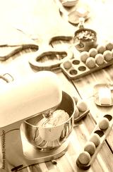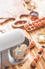 Ingredients for cozonac are meticulously arranged on a wooden table, featuring a mixer, flour, eggs, butter, and a jar of jam, capturing a warm baking atmosphere