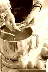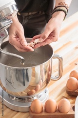 Ingredient preparation is underway as hands crack eggs into a stainless steel mixing bowl. Fresh eggs are neatly arranged nearby, ready for making cozonac, a traditional Romanian dish