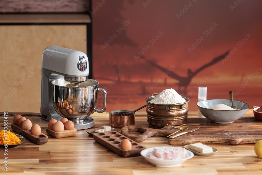 Mixing cozonac dough with eggs, flour, and butter, showcasing a cozy kitchen scene filled with essential baking ingredients that evoke holiday cheer and nostalgia