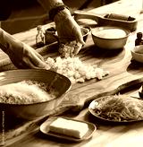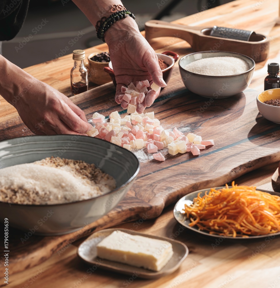 Hands prepare ingredients for cozonac, including flour, sugar, and orange zest, on a rustic wooden table. This traditional sweet bread evokes warm memories of holiday baking