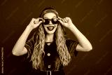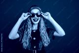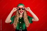 Young woman in festive elf costume wearing sunglasses with cheerful expression against a bright red background, feeling merry