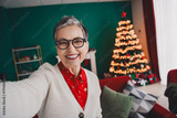 Joyful senior woman capturing a festive holiday selfie indoors with illuminated tree and cozy winter decorations