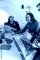 group of latin friends open gifts and eating cookies with hot chocolate for Christmas at home in Mexico. Holidays and celebration holidays in Latin America