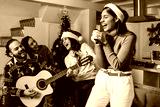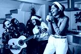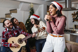 Latin friends singing in karaoke party celebrating christmas eve at home in Mexico Latin America, hispanic people in holidays