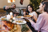 Latin friends having christmas dinner at home in Mexico Latin America, group of hispanic young people eating in Holidays and thanksgiving
