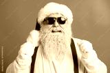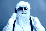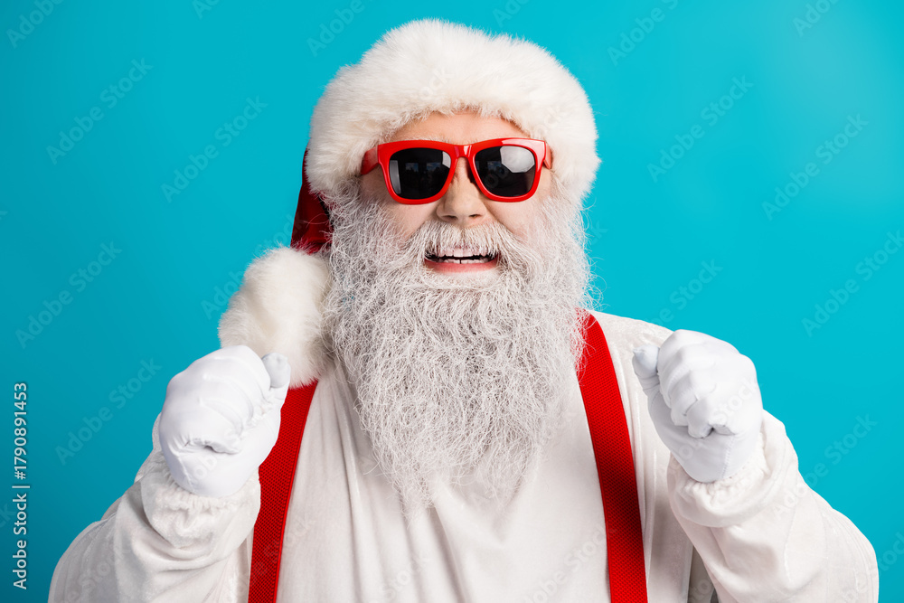 Santa in red hat suspenders and white beard smiles for a festive holiday photo against a blue background
