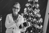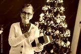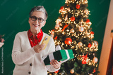 Elderly Woman Joyfully Holding a Smartphone and Gift by the Christmas Tree in a Beautifully Decorated Room