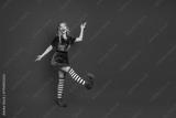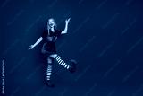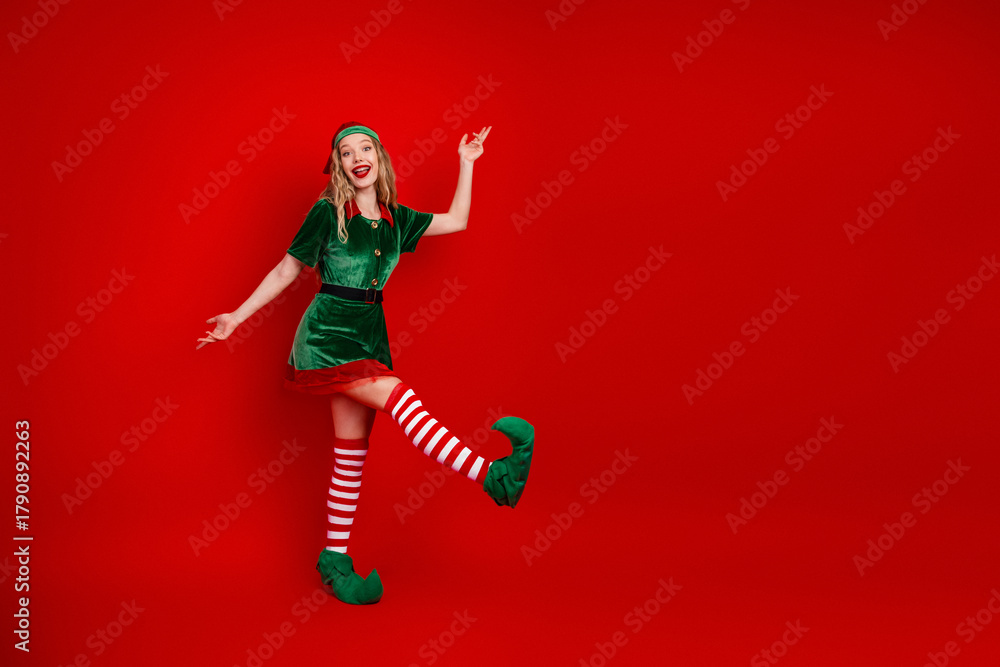 Festive young woman wearing elf costume posing joyfully in studio with vibrant red background emphasizing Christmas spirit